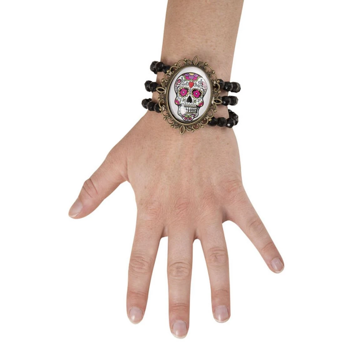 Le Bracelet médaillon Day of the Dead est un bijou composé de 3 rangs de perles et d’un médaillons sur lequel figure la tête de mort colorée symbole du « Dia de la Muerte » qui est le jour de la fête des morts au Mexique. Cet accessoire apportera la touche originale à votre déguisement d’Halloween. Happy Halloween !!!