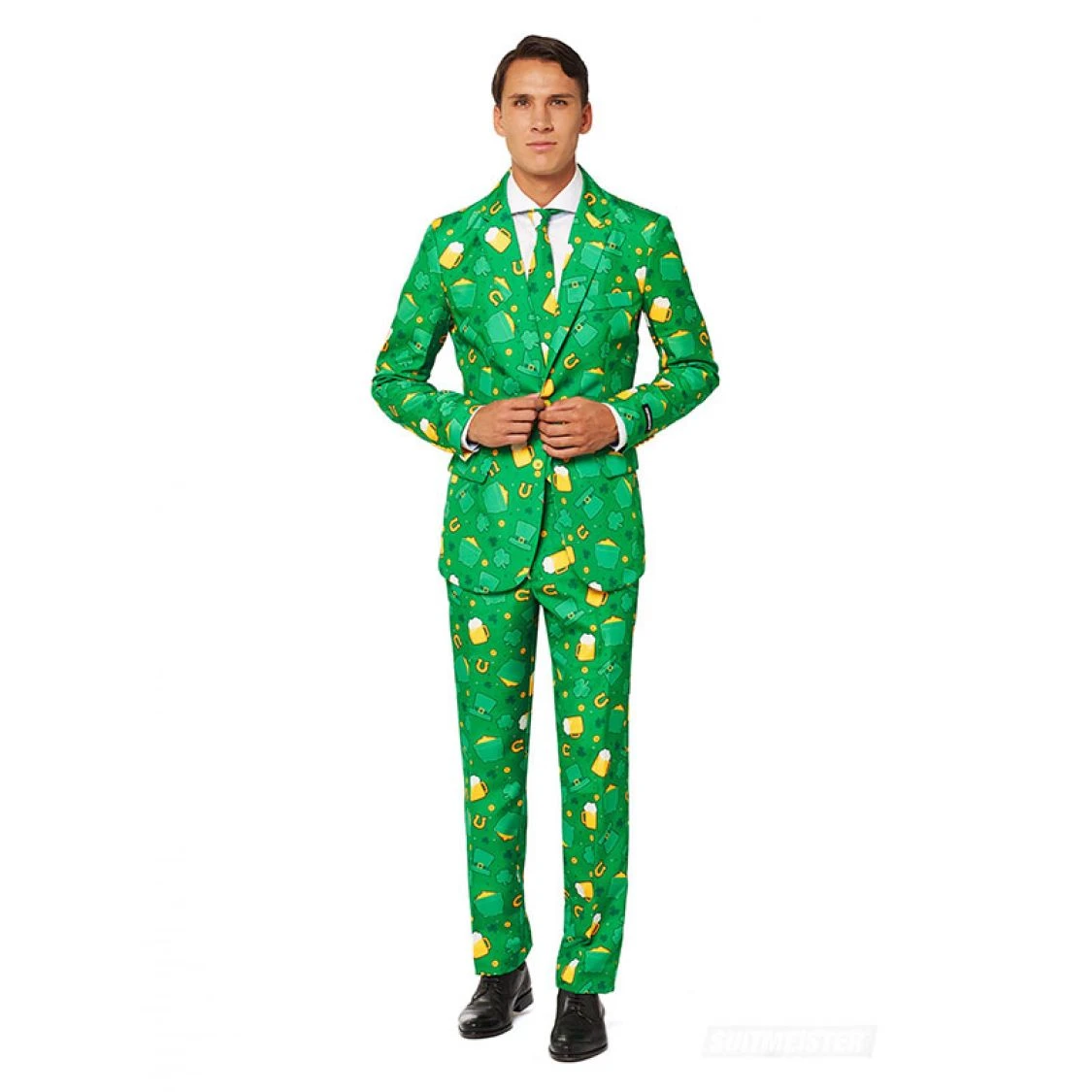 Le Costume Mr Suitmeister St Patrick homme est un costume très chic qui se compose d’une veste, d’une cravate et d’un pantalon. Ce tailleur est fait dans un tissu de belle qualité de couleur verte avec des motifs des symboles de la Saint Patrick. La veste du costume Mr Suitmeister se ferme à l’aide de deux boutons. Le pantalon assorti dans le même tissus, possède des poches à l’avant et à l’arrière. Il se ferme à l’aide d’une fermeture éclair. Soyez le plus élégant pour célébrer la Saint Patrick en enfilant ce magnifique costume porte bonheur rempli de trèfles.