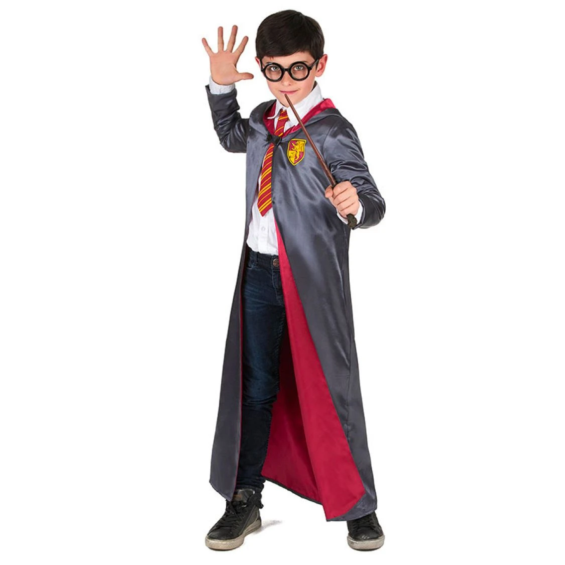 Voici un déguisement d’apprenti sorcier bien complet. Tout d’abord sa très jolie cape grise doublée de rouge bordeaux qui est longue et brillante, car elle a été réalisée dans un beau tissu satiné. Sur le devant le la cape a été apposé un écusson de couleurs jaune et rouge avec motif de lion. Ensuite pour compléter la cape de sorcier magicien, vous avez une cravate rayée au couleurs de l’écusson; rouge et jaune qui s’enfilera facilement grace à son élastique. La touche finale ce sera la paire de lunettes rondes et noires. Un fois ce costume d’apprenti sorcier enfilé, à vous toutes les formules magiques.
