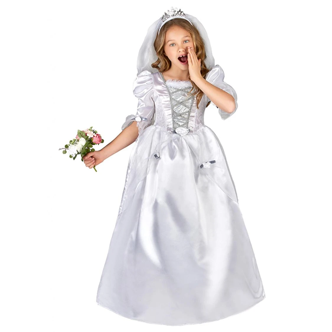 Le déguisement enfant Mariée fille luxe est un jolie déguisement blanc en tissu effet satiné. La robe longue de mariée a toujours fait rêver les petites filles. Ce beau déguisement mariée est composé d’une robe dont le haut est orné de broderies et de tulle sur le devant, avec des manches bouffantes. Quelques roses blanches décorent la robe . Pour compléter cette tenue de mariée, un diadème qui est un serre-tête qui est surmonté d’une petite couronne en tissu argenté brillant, avec du tulle blanc qui décorera la chevelure. Ce déguisement mariée est idéal pour le carnaval, goûté anniversaire ou autre un après-midi déguisé entre amis. Il pourra également fair l’objet d’un joli cadeau d’anniversaire ou d’un cadeau de Noël.