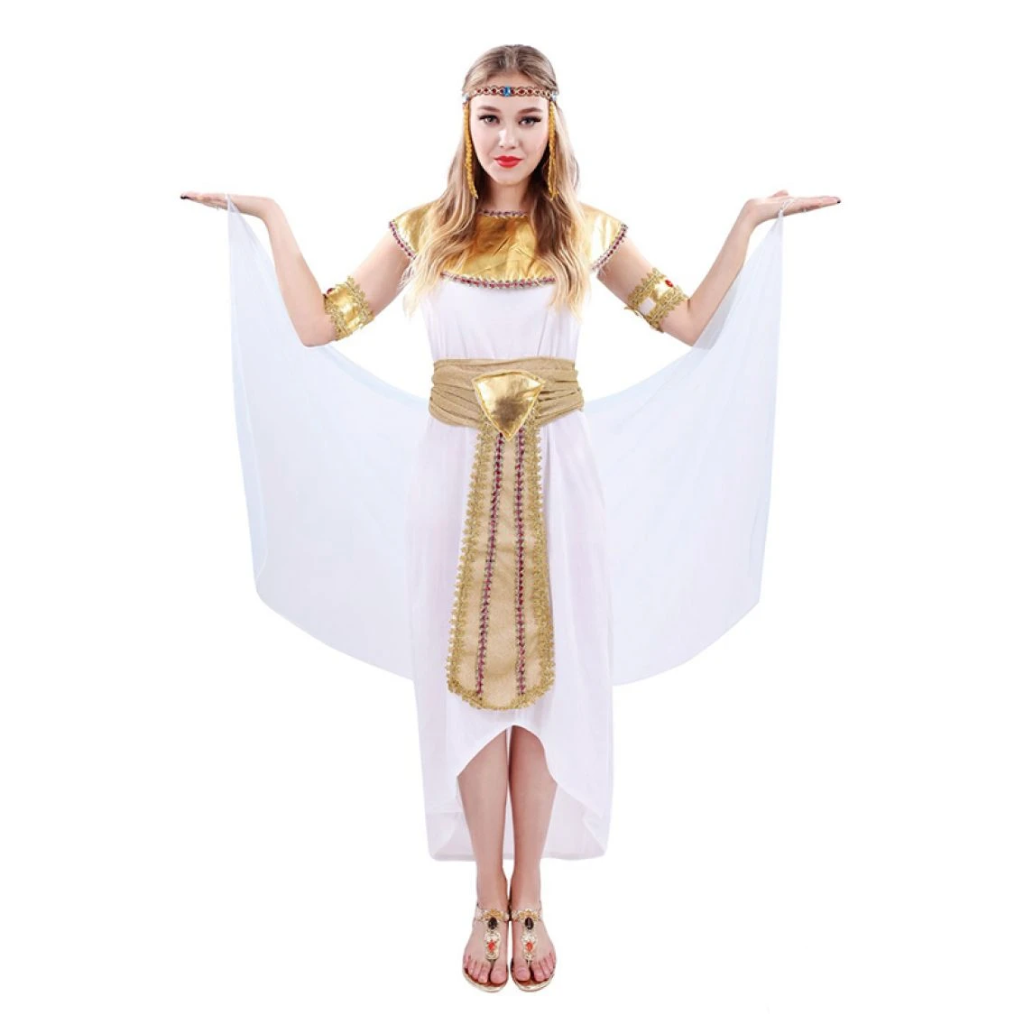 Faites revivre l’ère des pharaons avec ce Costume de Reine Egyptienne ! Vous allez faire un clin d’oeil au Pyramides, juste en enfilant ce costume d’Egyptienne. Ce déguisement egyptien est composé d’une robe blanche ornée d’une ceinture et d’un col doré. Pour donner la touche final 2 manchons et une coiffe sont également fournis. Avec le costume Egyptien vous vous retrouverez au temps du Grand sphinx, de l’Egypte et de ses mystères.