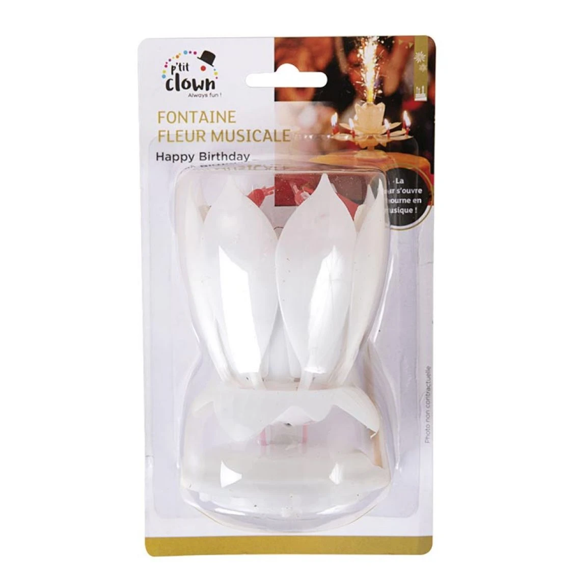 La fontaine fleur d’étincelles, est une fleur en plastique, qui lorsqu’on l’allume s’ouvre et laisse apparaitre des bougies et une fontaine scintillante. Cette fontaine fleur est en plus musicale. Elle apportera une note d’originalité à votre gâteau d’anniversaire et vous permettra d’épater vos amis à l’occasion de toutes les fêtes d’anniversaire. D’une part La Fleur d’étincelles décorera votre gâteau et l’animera avec un festival de d’étincelles et quelques notes de musique, le spectacle est garanti. Happy Birthday, Joyeux Anniversaire !!!!