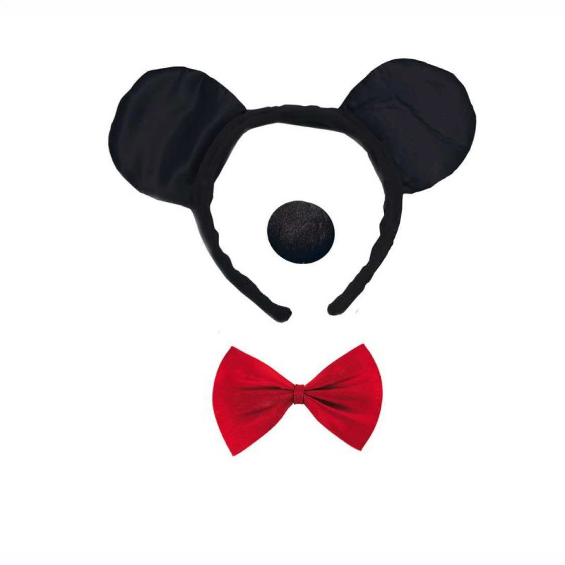 En complément de vos costumes, choisissez ce set souris comprenant un serre tête, queue et noeud papillon couleur noir et rouge, comme la souris de Disney.